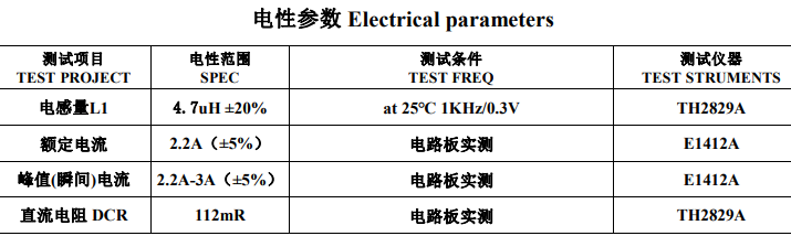 The rated current is measured at 2.2A with the instrument E1412A, and the tolerance is stable at 5%, which ensures excellent temperature rise current and saturation current characteristics in high-frequency and high-temperature environments.