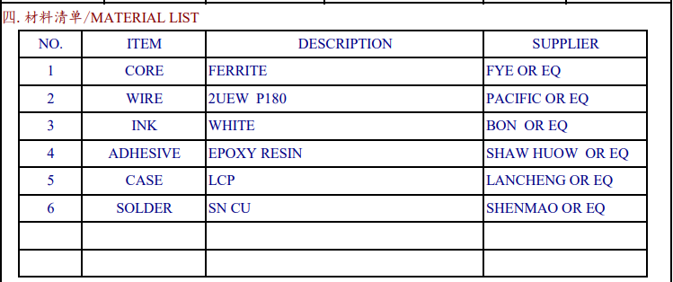 The bill of materials covers many key materials, such as CORE FERRITE and WIRE, and each material has a clear description of the supplier or equivalent material, such as CORE FERRITE from FYE or equivalent supplier, WIRE using 2EWP180, PACIFIC or equivalent supplier, etc. These high-quality materials provide a basic guarantee for the high performance of products.