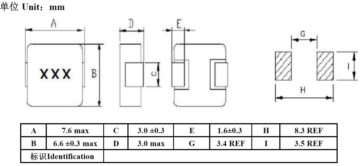 The following figure shows the structure and dimensions of XR0630-4R7M integrated inductor. Compared with the conventional inductor structure, this structural design has the following characteristics and advantages: