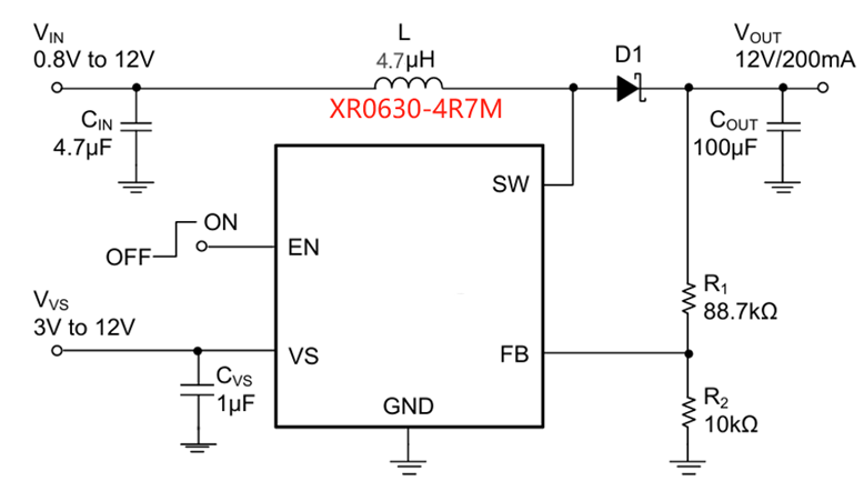 As shown below, it is a typical application scheme of miniaturized integrated XR0630-4R7M inductor in switching power supply boost circuit. The input voltage range of this application scheme is 0.8V~12V, the output voltage is 12V, and the maximum load current is 200mA.